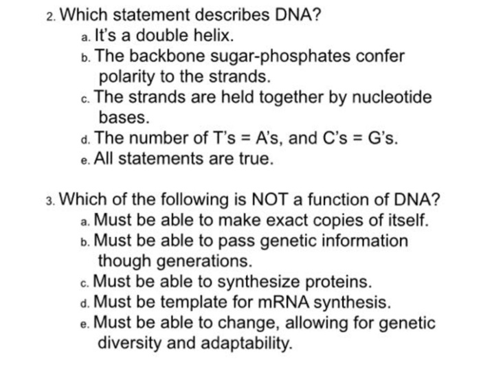 Solved Which Statement Describes Dna A It S A Double Chegg Com